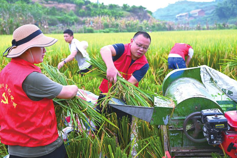 党员干部下田抢收的情景,当日也在双石镇石塔村6组缺劳农户曾永发的稻田里上演着。在副镇长蒋思勇的带队下,通过20名镇村党员干部、荣县退役军人志愿服务队队员的共同努力,两小时前还站立在田里的约6亩水稻,全部变成一颗颗稻子送到了曾永发的晒坝里。“这么早、这么热的天气,你们还来帮我打谷子,太感谢了!”曾永发感激地说。