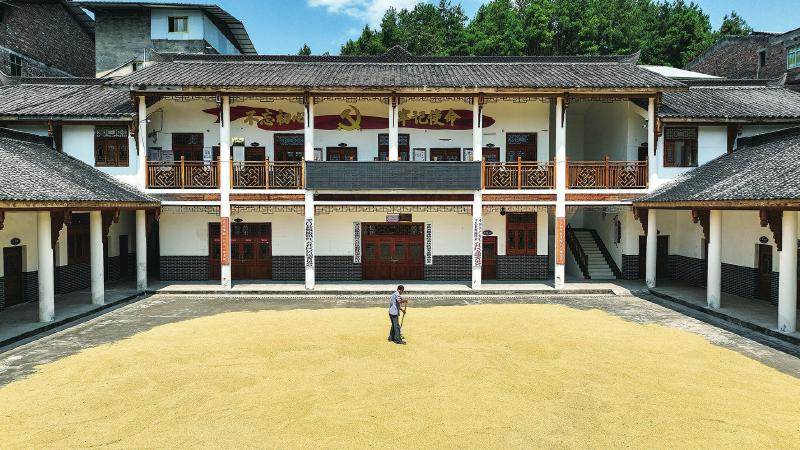 村民在社区院坝晾晒收获的稻谷。