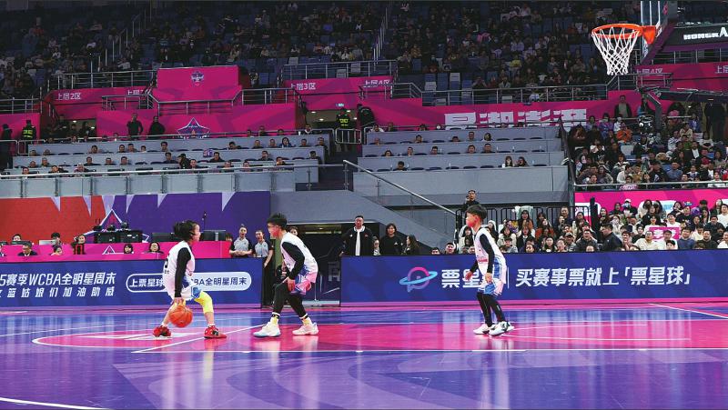 突围“小孩哥”辜禹乐和白乐轩的防守后,随着11岁的“小孩姐”陈思燃起跳、投篮,篮球精准投入篮筐中,赛场上的观众和运动员们激动地站起来为三位小朋友加油鼓劲。这是2月23日发生在2024-2025赛季中国女子篮球联赛(WCBA)全明星周末正赛(下文简称“WCBA全明星赛”)上的一幕。