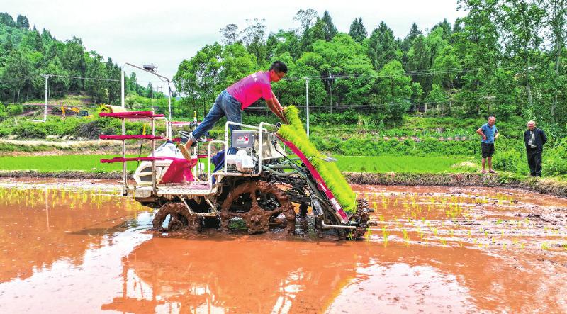 5月29日,伴随着轰鸣的机器声,在宣汉县下八镇长春村,集中连片、设施完善的高标准农田里,全程机械化插秧为当地农业生产按下了“快进键”。