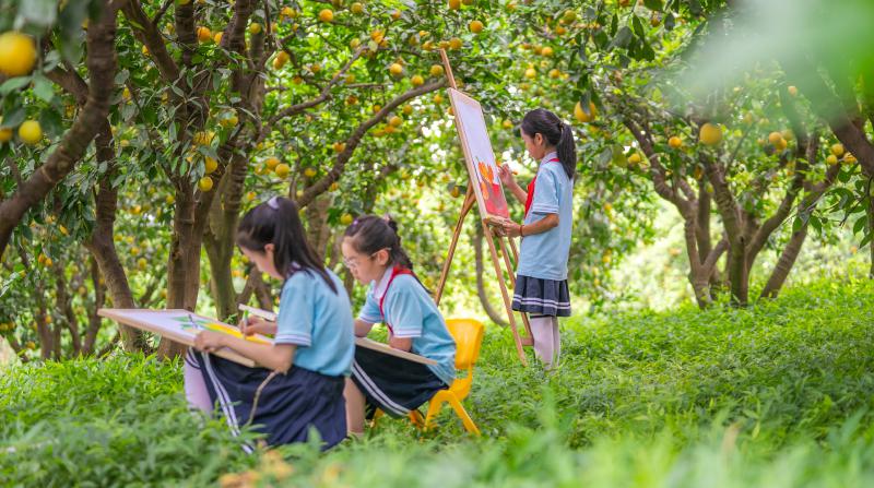 目前,眉山市彭山区黄丰镇的夏橙迎来丰收,漫山遍野的柑橘林里,黄澄澄的橙子挂满枝头,果香四溢。 6月19日,彭山区实验小学美术社团的学生们走进黄丰镇柑橘林,开展户外写生活动,他们用画笔描绘家乡的丰收美景,为夏日增添了一抹独特的色彩。 邓淋瀚 摄