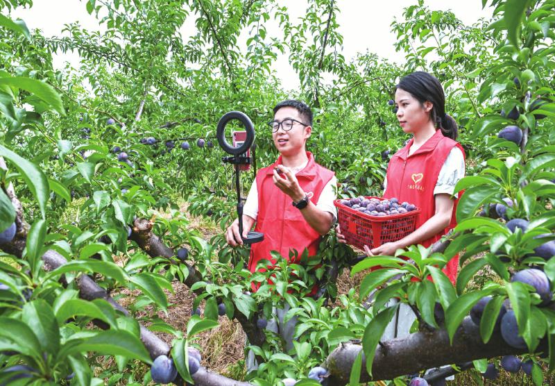 6月20日,广安市广安区西部计划志愿者在彭家乡向阳社区金堆子农场直播五月脆李丰收助力李子线上销售。 近年来,该区采取“村集体+合作社+农户”的模式,在彭家乡、大龙镇、石笋镇等乡镇规模发展五月脆李、蜂糖李等李子产业 1.2万余亩。当前,正值五月脆李成熟上市的时节,众多市民和游客来到产业园内品尝和采摘李子,带动乡村旅游发展,助力农业增效、农民增收。 张国盛 摄