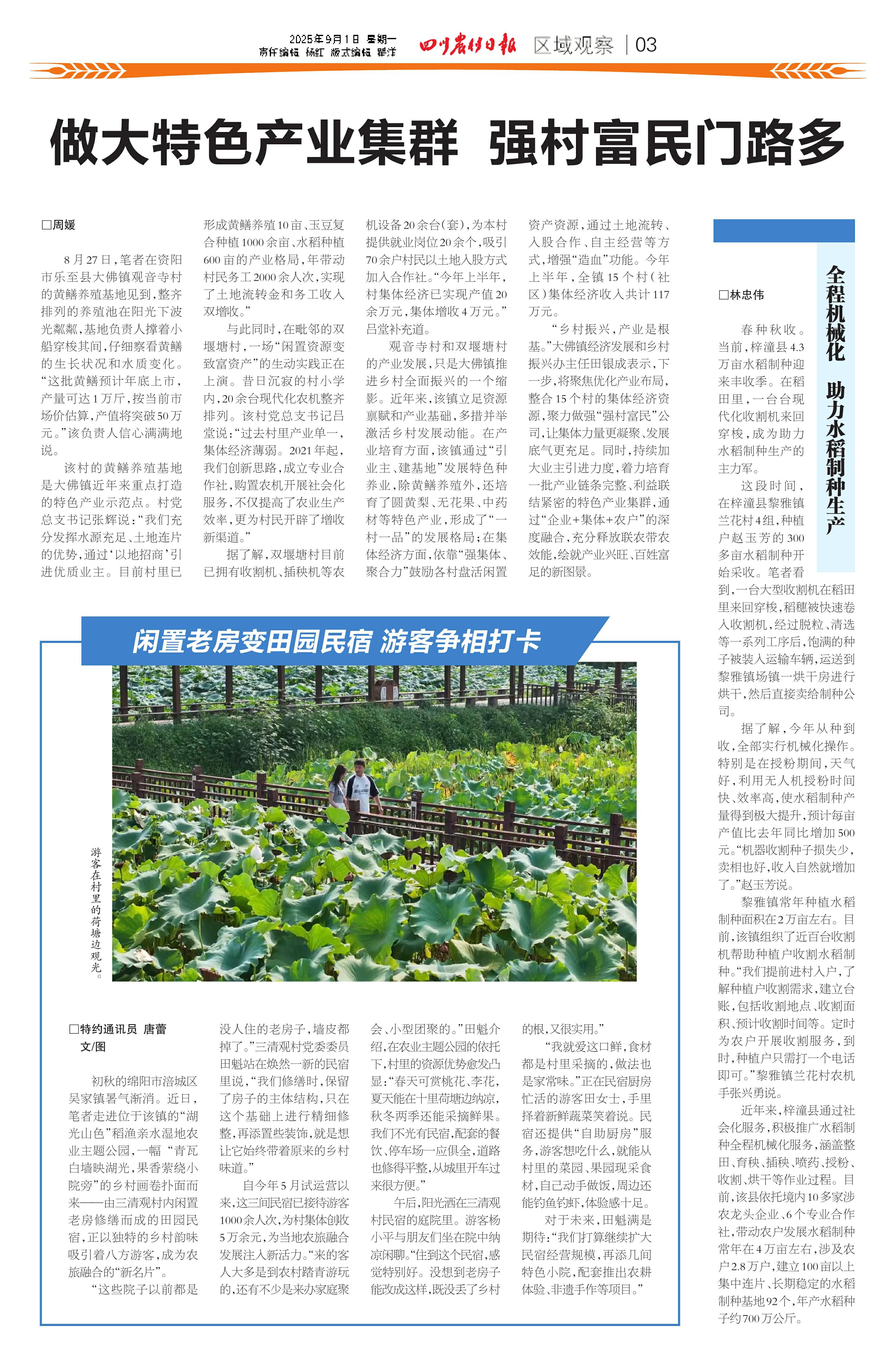 初秋的绵阳市涪城区吴家镇暑气渐消。近日,笔者走进位于该镇的“湖光山色”稻渔亲水湿地农业主题公园,一幅“青瓦白墙映湖光,果香萦绕小院旁”的乡村画卷扑面而来——由三清观村内闲置老房修缮而成的田园民宿,正以独特的乡村韵味吸引着八方游客,成为农旅融合的“新名片”。