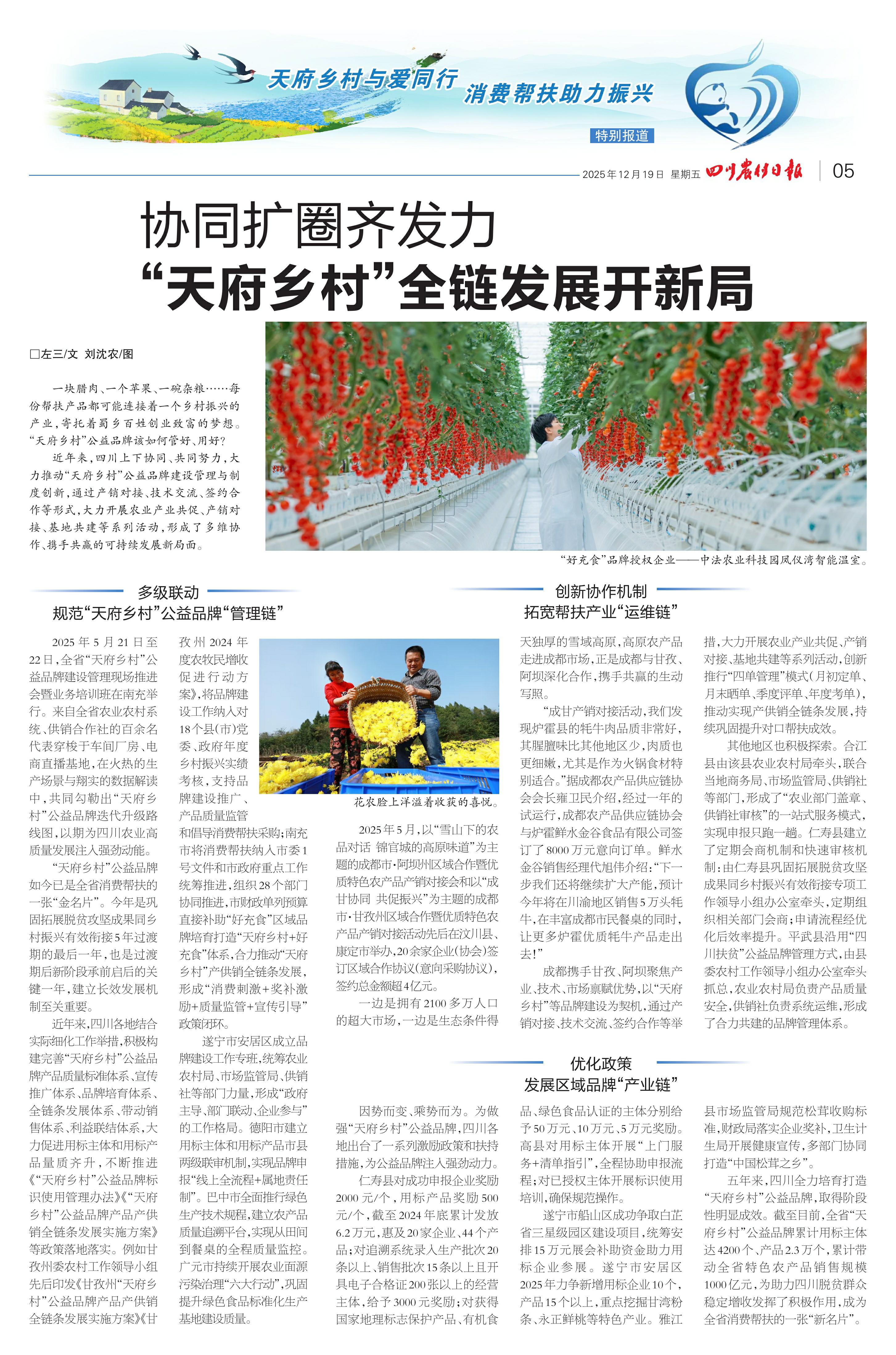 近年来,四川上下协同、共同努力,大力推动“天府乡村”公益品牌建设管理与制度创新,通过产销对接、技术交流、签约合作等形式,大力开展农业产业共促、产销对接、基地共建等系列活动,形成了多维协作、携手共赢的可持续发展新局面。