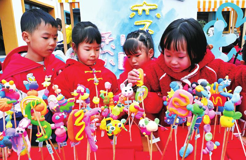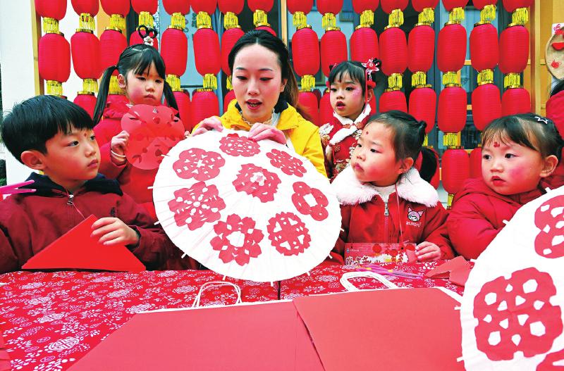 12月26日,眉山市仁寿县城北幼儿园开展“学民俗 迎新年”活动,小朋友们在老师的指导下,通过学剪纸、布艺制作、黏土创作等,体验传统文化魅力,喜迎新年的到来。