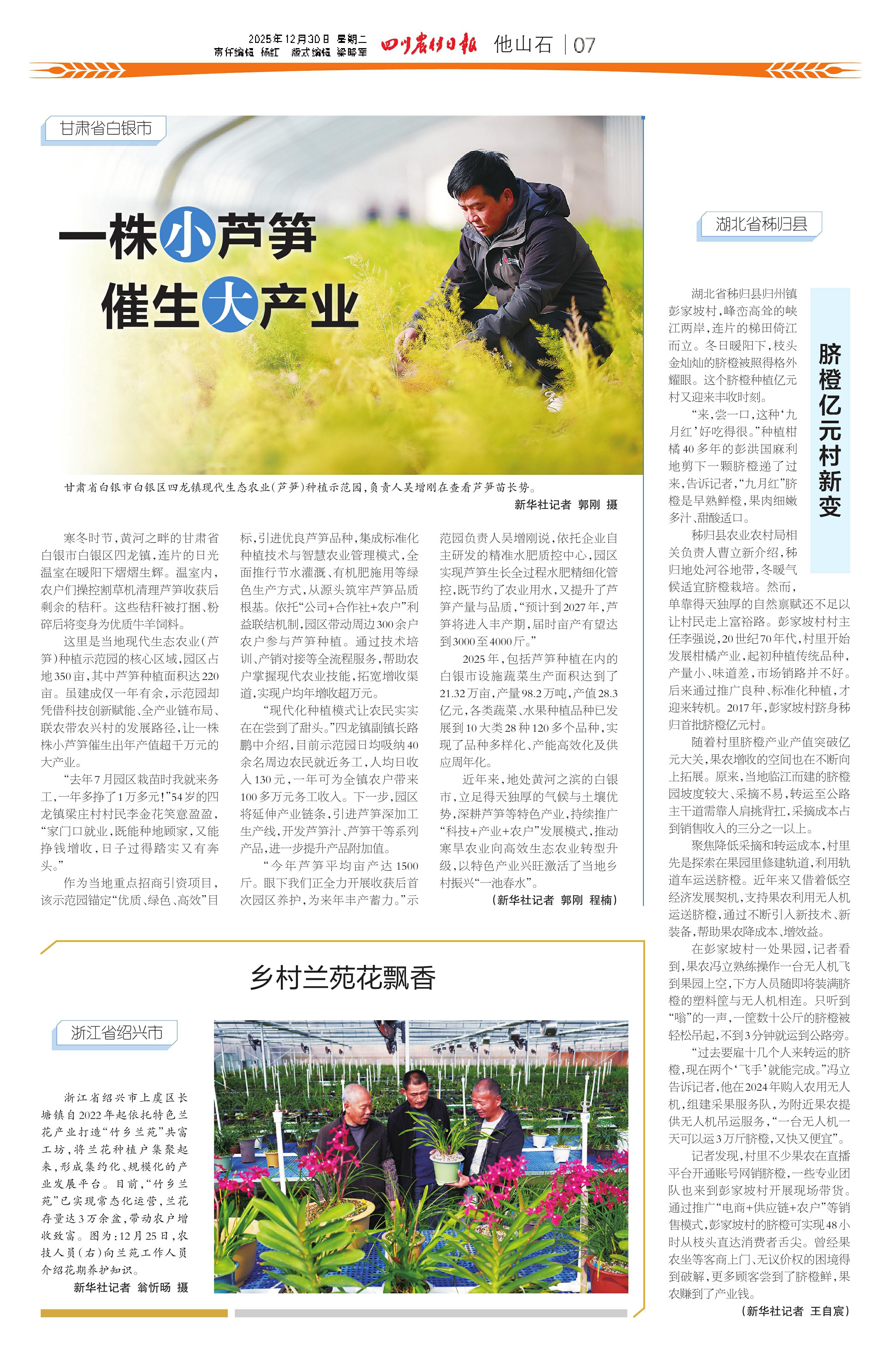 “今年芦笋平均亩产达 1500斤。眼下我们正全力开展收获后首次园区养护,为来年丰产蓄力。”示范园负责人吴增刚说,依托企业自主研发的精准水肥质控中心,园区实现芦笋生长全过程水肥精细化管控,既节约了农业用水,又提升了芦笋产量与品质,“预计到2027年,芦笋将进入丰产期,届时亩产有望达到3000至4000斤。”