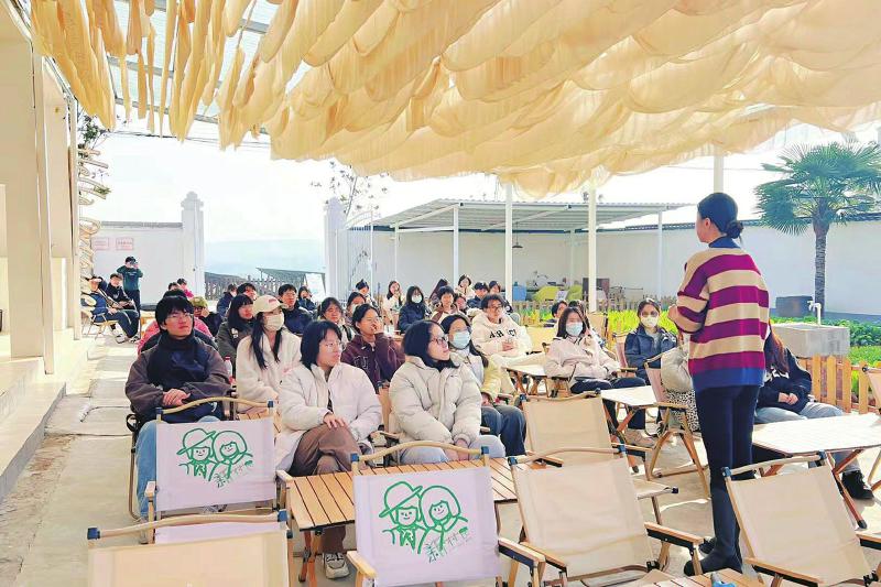 这个占地约600平方米的城乡文化空间交流站不止是一个咖啡馆。两年多来,郎慧琛和武飞利用美术专业特长,为当地农产品进行包装设计,并通过电商直播,助力农产品销售;依托向湾村的红色旅游资源,设计了一系列文创产品;发起“做一天的新村民”“新村民公益课堂”“乡村读书会”等文娱活动和培训……“这里已经融合乡村咖啡馆、乡村直播间、乡村书店、文创工作室、特色农产品推广销售、乡村精品旅游等多种功能。”跟随郎慧琛的介绍,记者看到这个布局别致的小院内,还设有设计室、直播间和阅读角。