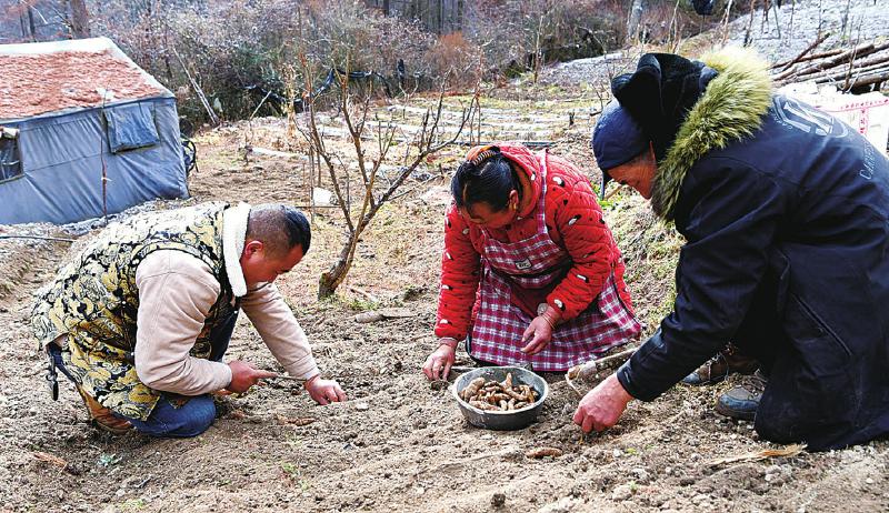 隆冬时节,平均海拔2400 米的汶川县卧龙镇卧龙关村,山间白雪皑皑,云雾在松林间缭绕。1月5日,30多岁的杨平茂和父母走进半山腰的林地间,小心翼翼地拨开埋好的菌材,将一块块饱满的乌天麻种麻均匀摆放,再娴熟地覆盖上一层细细的湿土。