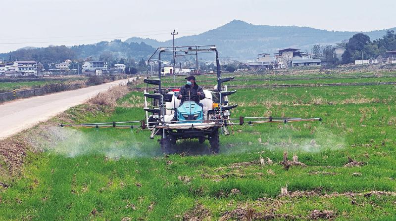 而在中江县产粮重镇永太镇,种粮大户常滔的稻茬小麦已是绿油油的连片之势。他在田间忙不迭地安排工人安装育秧输送设备,备战大春。