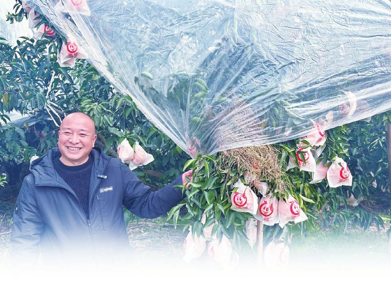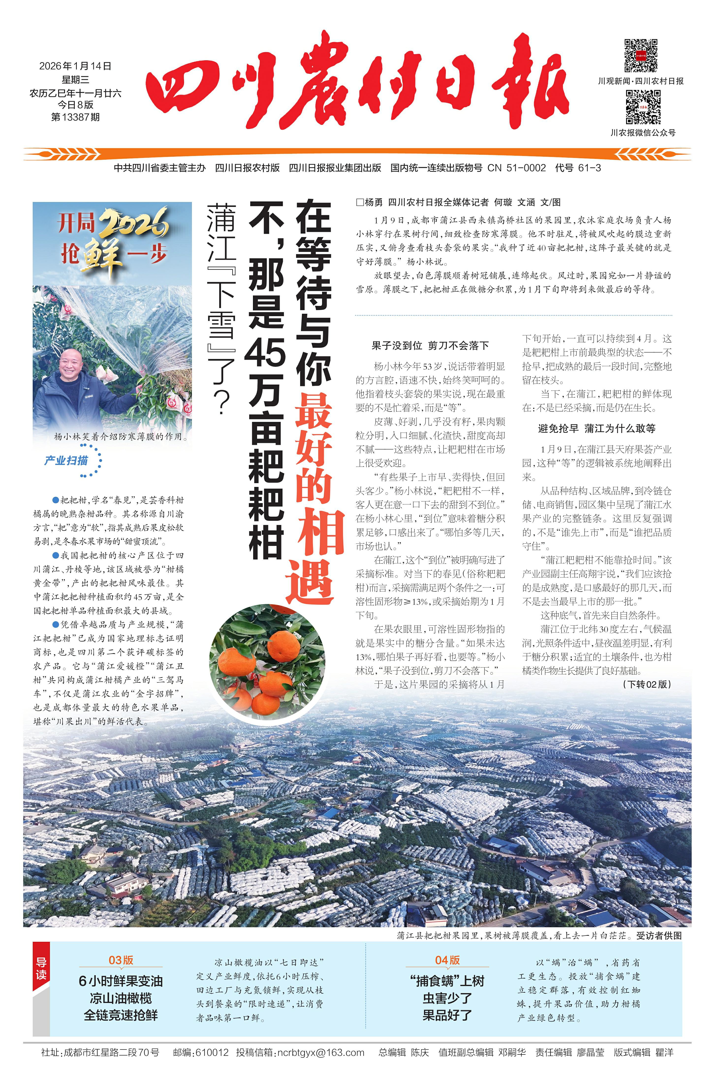 1月9日,成都市蒲江县西来镇高桥社区的果园里,农沐家庭农场负责人杨小林穿行在果树行间,细致检查防寒薄膜。他不时驻足,将被风吹起的膜边重新压实,又俯身查看枝头套袋的果实。“我种了近40亩耙耙柑,这阵子最关键的就是守好薄膜。”杨小林说。