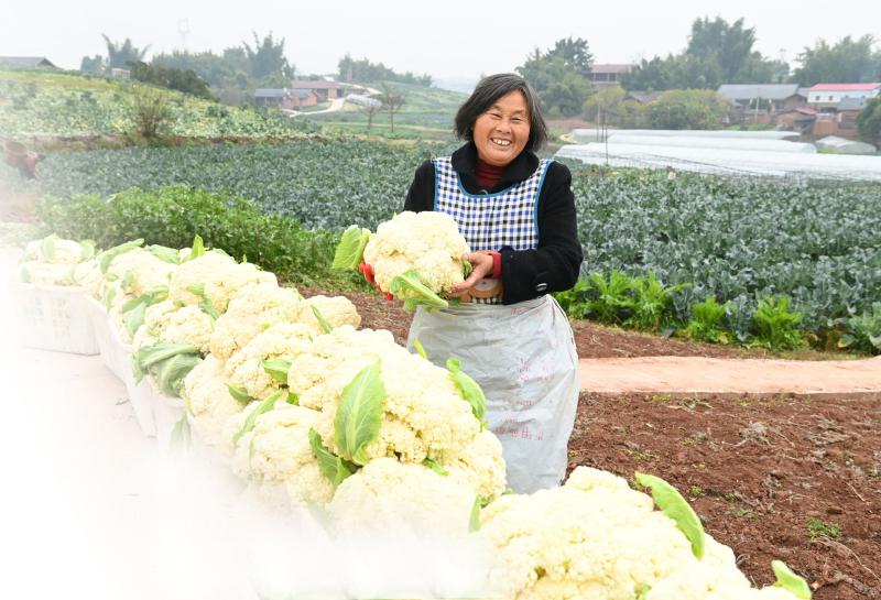 罗德琼是回龙殿村11组组长,夫妻俩种菜近 30 年。当天,他们正在出售白花菜。“一亩产量6000多斤。”罗德琼边劳作边算账,“虽然现在价格低,批发价一斤0.7至0.8元,但一亩地也能挣4000至5000元,10亩花菜总收入不少于4万元。”