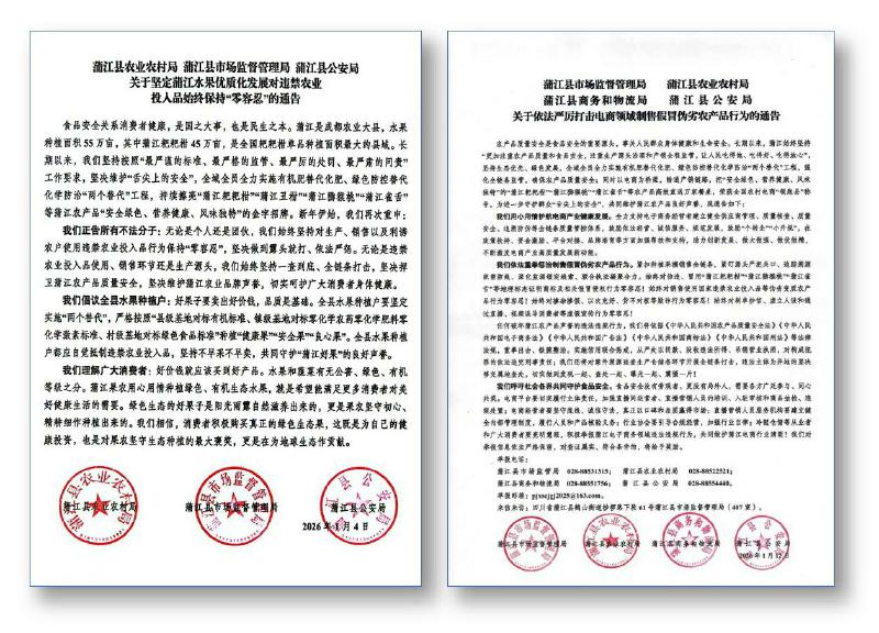 农产品品牌是地域农业发展的核心资产,更是乡村全面振兴的重要支撑。新年伊始,成都市蒲江县多部门联合接连发布关于对违禁农业投入品始终保持“零容忍”、严厉打击电商领域制售假冒伪劣农产品的通告,当地农民专业联合社随即发布响应书并出台具体行动方案,一系列举措不仅彰显了蒲江守护“蒲江耙耙柑”“蒲江猕猴桃”等金字招牌的坚定决心,更勾勒出中国县域农产品品牌建设从“重生产”向“重品质、重品牌”转型的时代图景。