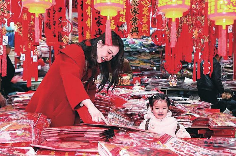 乐山市嘉定北路年货市场。年画摊前,胖娃娃抱鲤鱼的图样被摩挲得发亮。