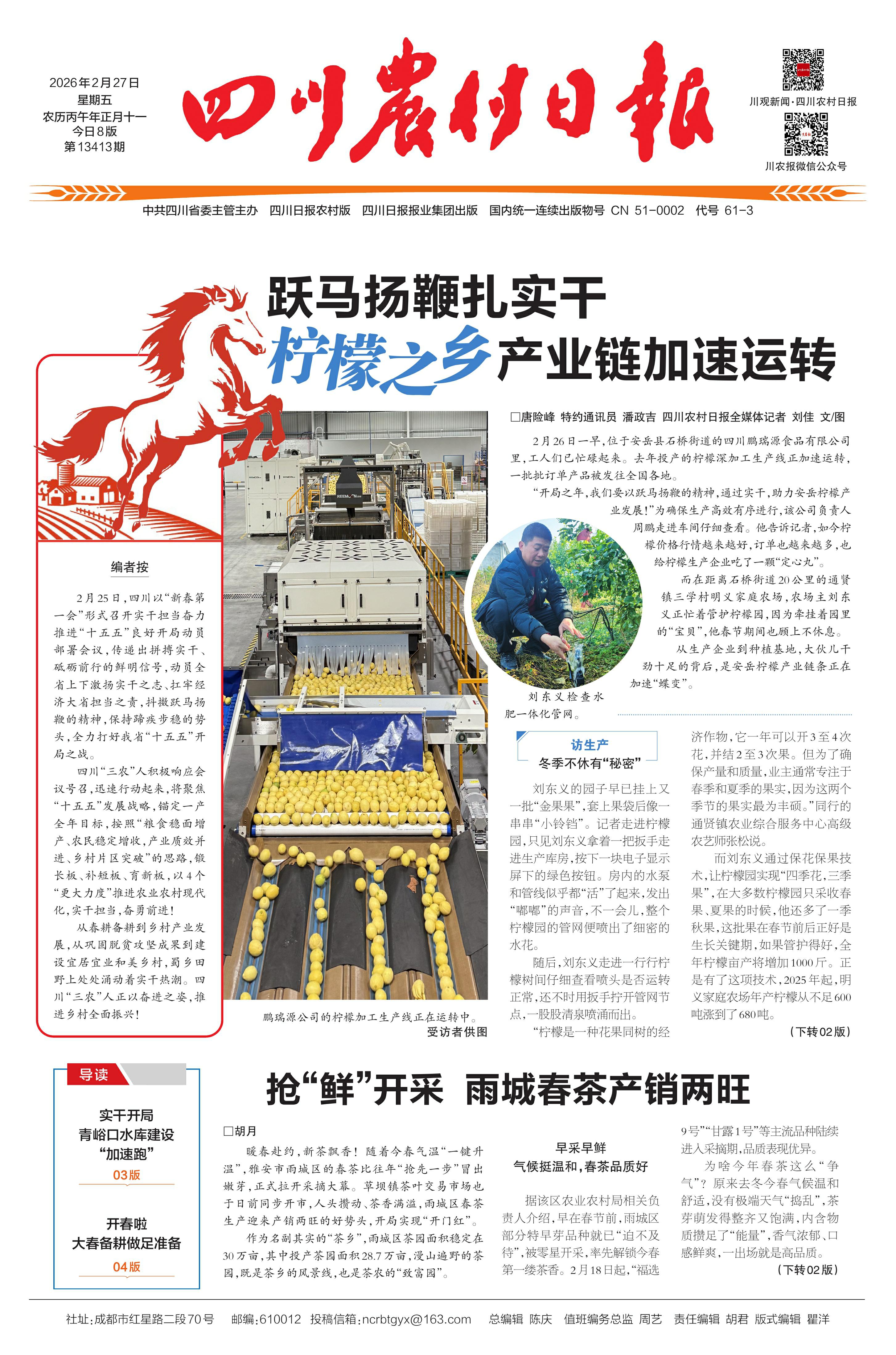 2月26日一早,位于安岳县石桥街道的四川鹏瑞源食品有限公司里,工人们已忙碌起来。去年投产的柠檬深加工生产线正加速运转,一批批订单产品被发往全国各地。