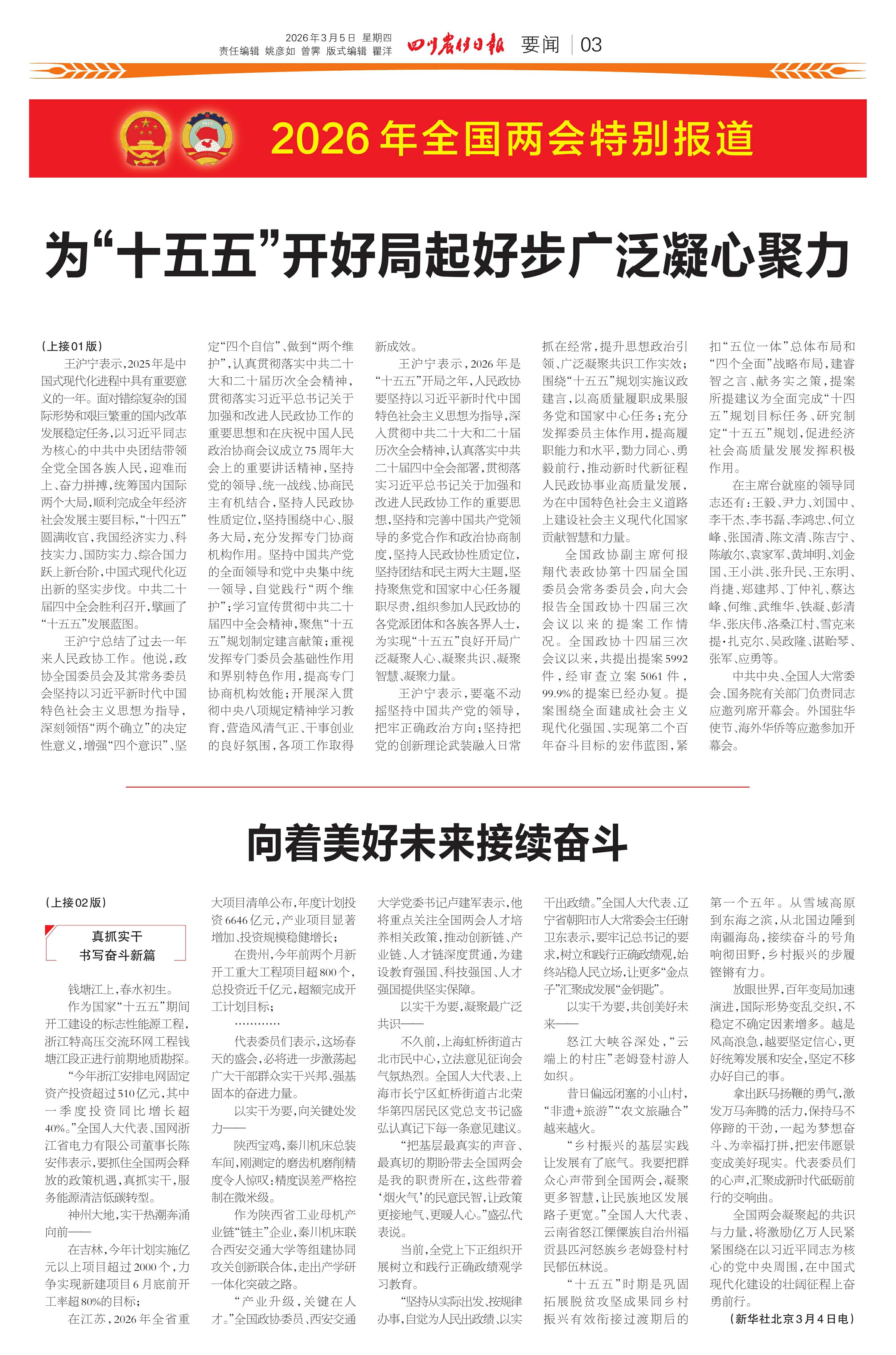全国两会上,代表委员们的共识更加强烈:团结一心,扛起时代使命,抢抓难得机遇,增强必胜信心,奋力为“十五五”发展打下坚实基础。