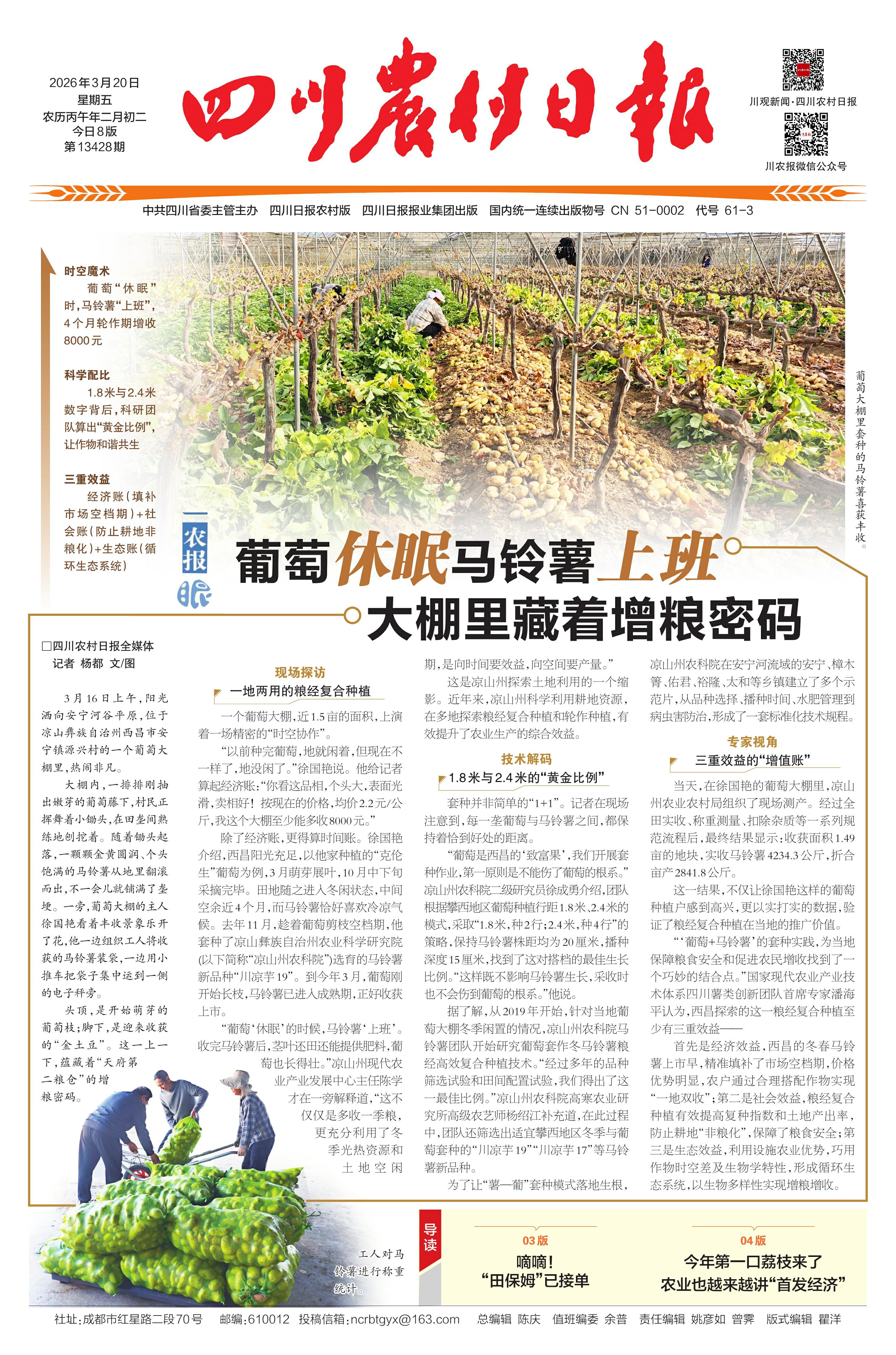 “葡萄‘休眠’的时候,马铃薯‘上班’。收完马铃薯后,茎叶还田还能提供肥料,葡萄也长得壮。”凉山州现代农业产业发展中心主任陈学才在一旁解释道,“这不仅仅是多收一季粮,更充分利用了冬季光热资源和土 地 空 闲期,是向时间要效益,向空间要产量。”
