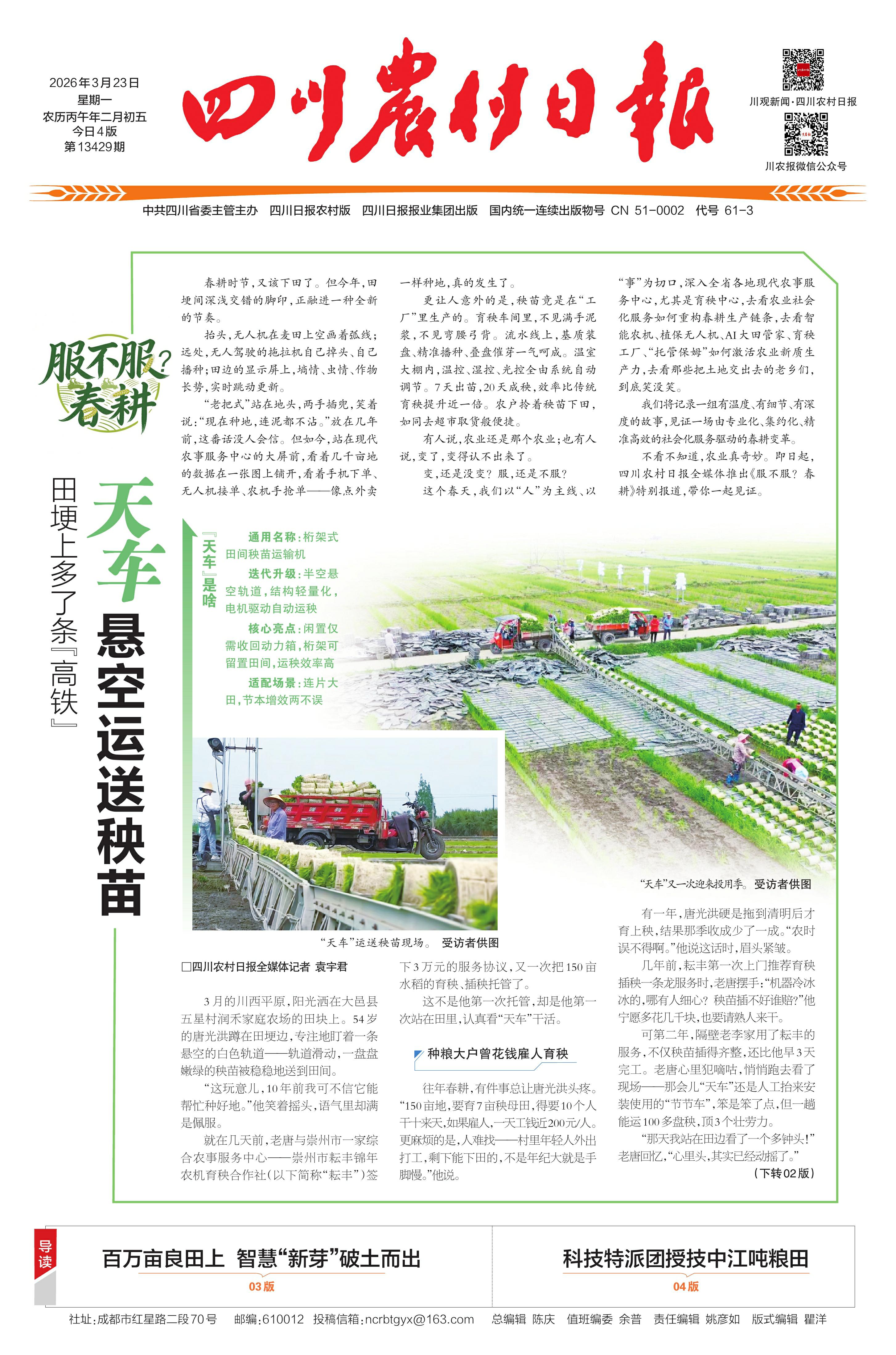 3月的川西平原,阳光洒在大邑县五星村润禾家庭农场的田块上。54岁的唐光洪蹲在田埂边,专注地盯着一条悬空的白色轨道——轨道滑动,一盘盘嫩绿的秧苗被稳稳地送到田间。