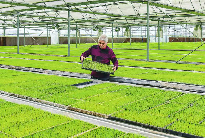 3月23日,工人在广安市广安区悦来镇灯塔村工厂化育秧中心查看水稻秧苗长势情况。 该区加大农业科技创新和技术推广力度,先后在悦来镇灯塔村、花桥镇冲锋村等地建成工厂化育秧中心,以科技力量助力农业生产。张国盛 摄