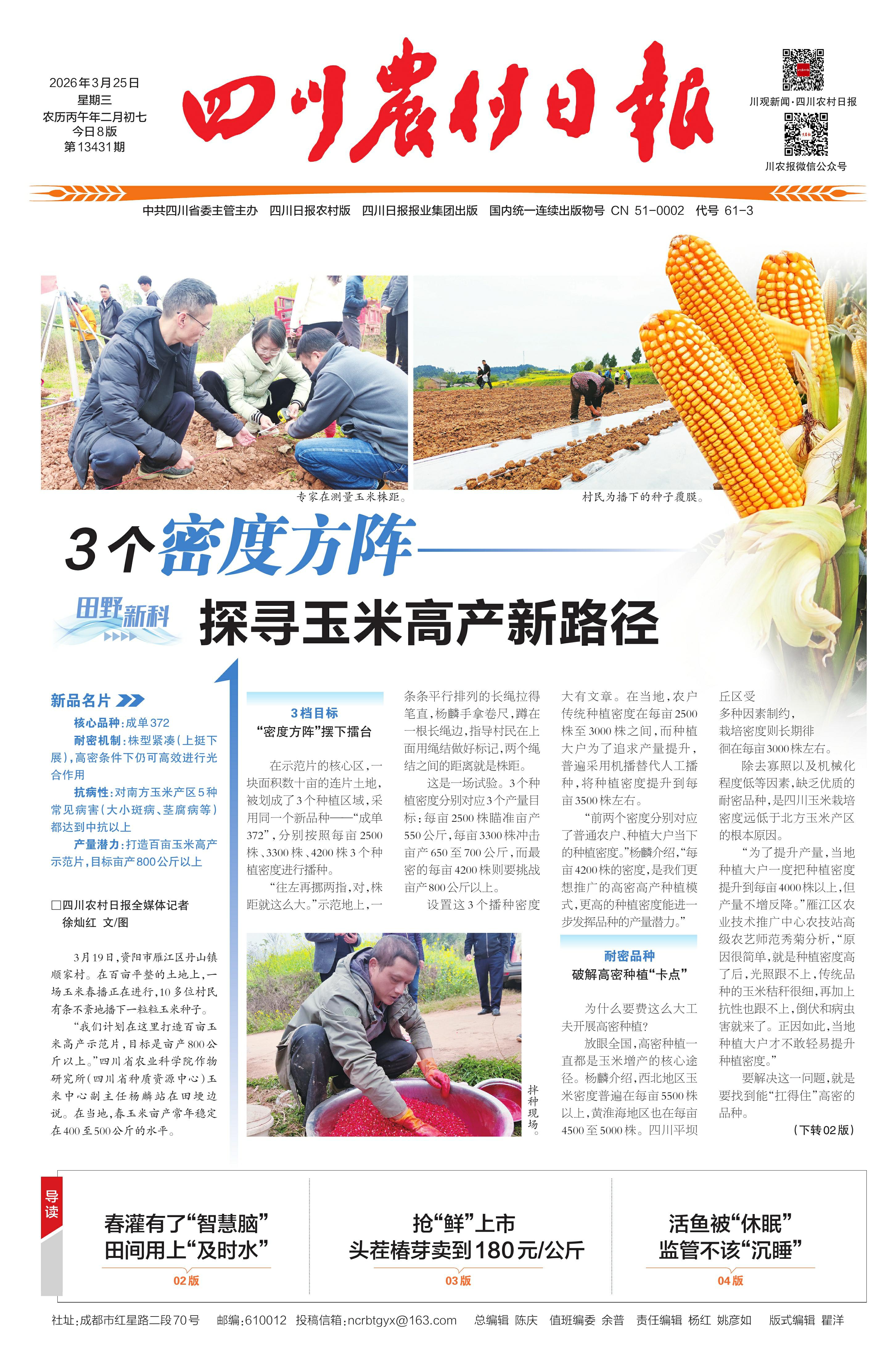 四川均隆生物科技有限公司董事长章存均向记者介绍,今年将在四川、云南等地开展“成单372”百亩高产示范,覆盖高、中、低海拔地区。章存均说:“我们要给种植大户蹚出一条路,到底种什么品种、怎么种,才能真正实现高密高产。”