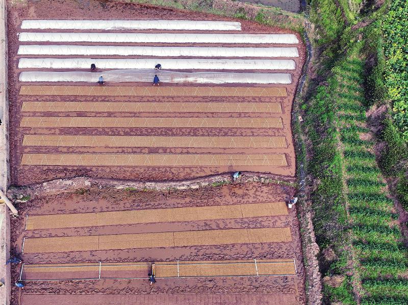 播种一结束,保温工序立即跟上。朱德刚卷起裤脚下田,指导工人搭建竹架拱棚,覆盖薄膜,再用泥巴压严膜边,防风防冻防雨水冲刷。“膜边不压实,种子易受冻,这步绝不能马虎。”朱德刚一边操作一边提醒大家。