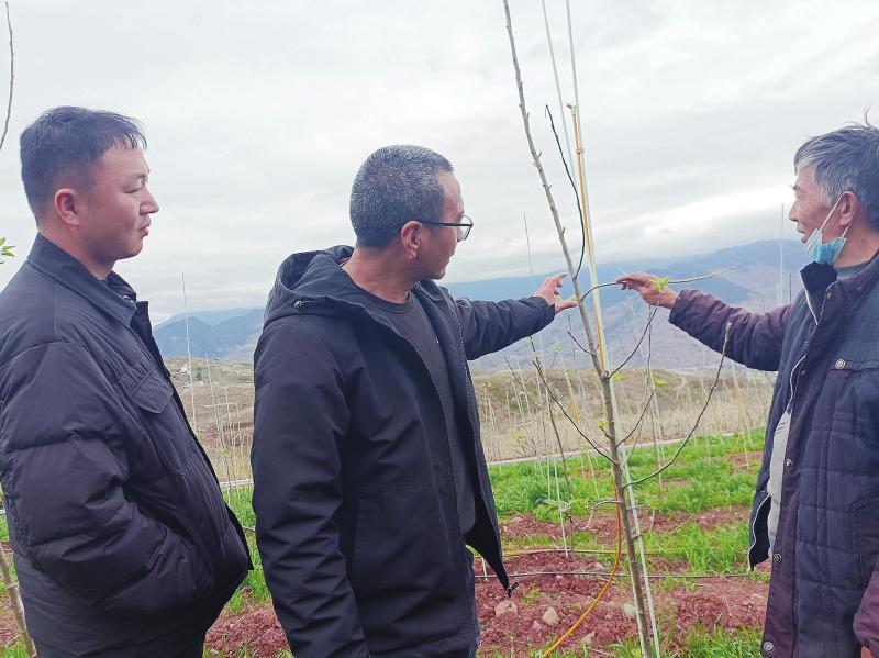 近日,在富林镇太平村的“汉源县新品种试验示范基地”里,记者看到,年前引种的苹果新品种“瑞雪”“土歧”“众成 3 号”、甜樱桃新品种“明5-5”“玲珑脆”、李子新品种“蜜饯”“龙李”等近800株树苗,已抽出了嫩绿的新芽。