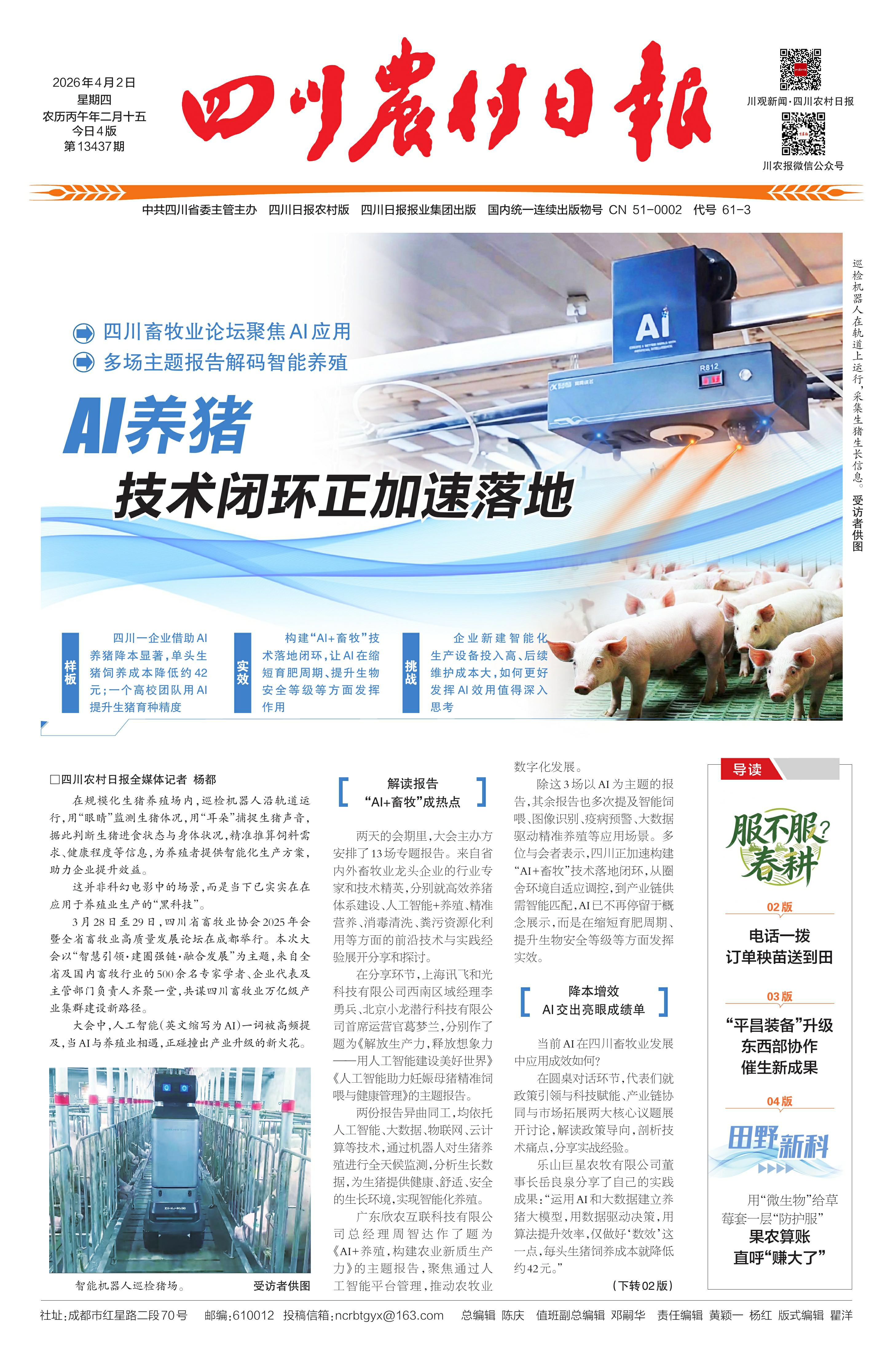 四川省农业农村厅畜牧兽医局局长李宗明表示,四川作为全国生猪养殖大省,推广AI技术帮助畜牧企业挖掘生产潜力、提升市场竞争力,是当前推动产业高质量发展、实现“智慧引领”的关键抓手。今年,四川将继续加大智能化养殖技术推广力度,助力畜牧企业尤其是生猪养殖企业降本有路径、增效有方法、发展有底气。
