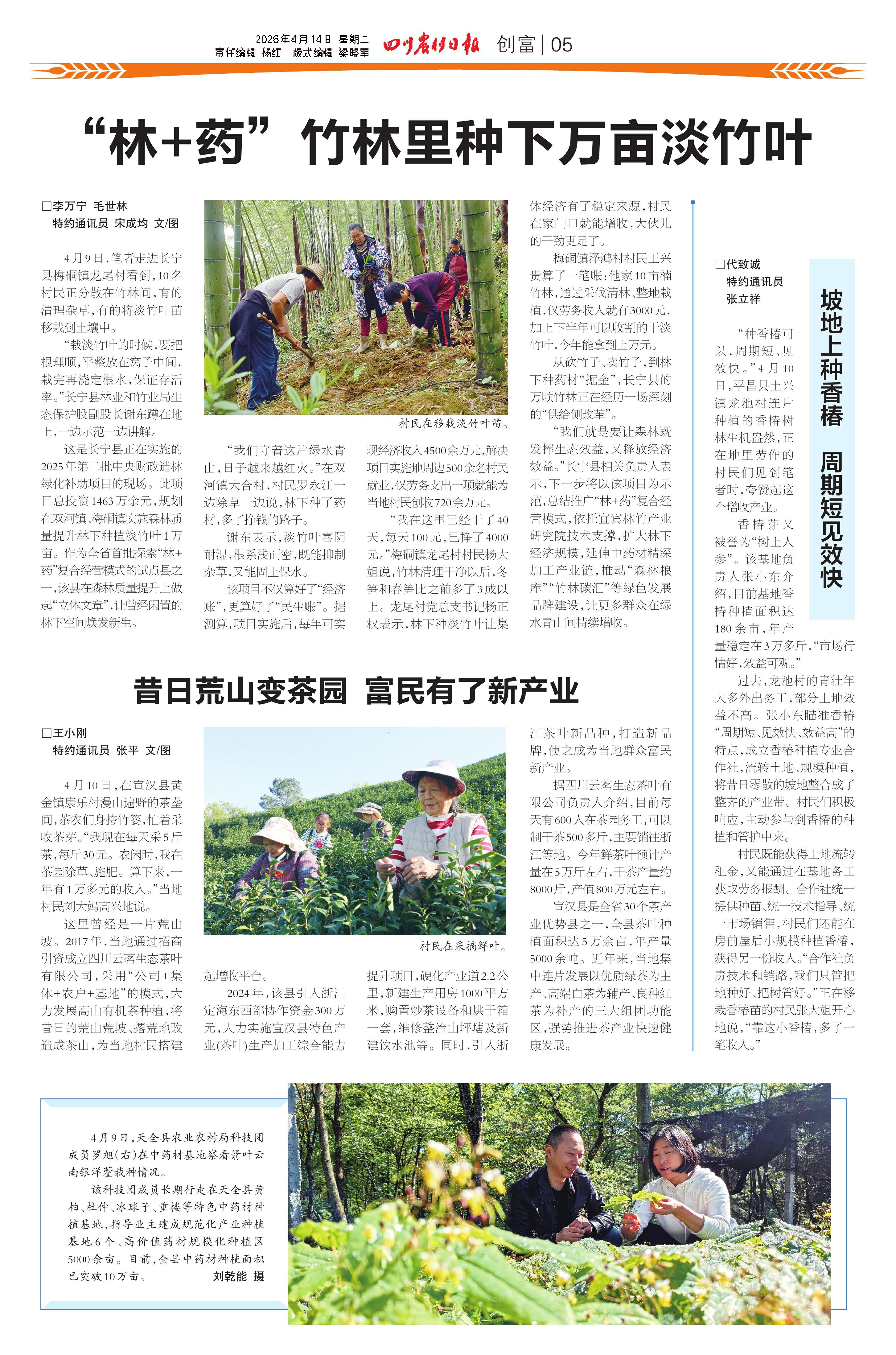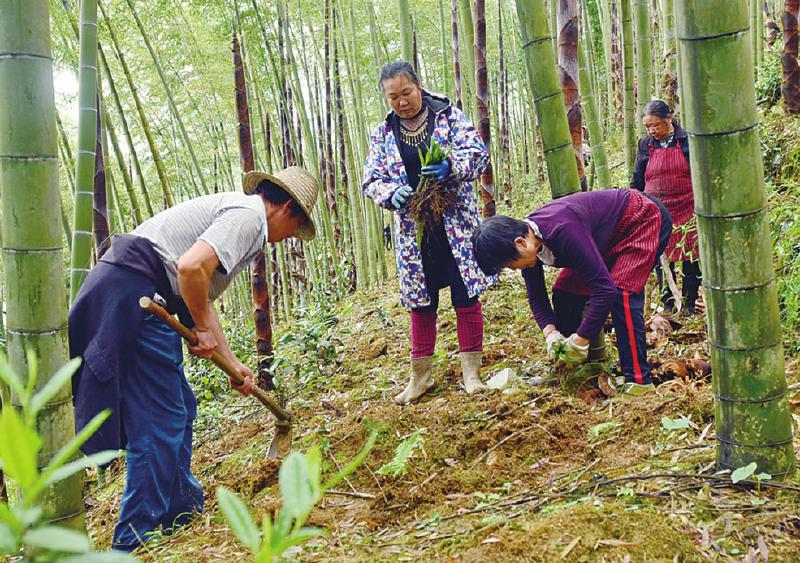 4月9日,笔者走进长宁县梅硐镇龙尾村看到,10名村民正分散在竹林间,有的清理杂草,有的将淡竹叶苗移栽到土壤中。