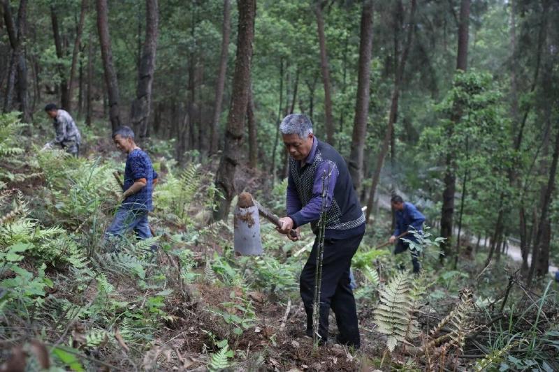 在丰禾镇先进村的山坡上,村民们挥锹挖坑,让一株株嫩绿的刺黑竹幼苗扎根林间。