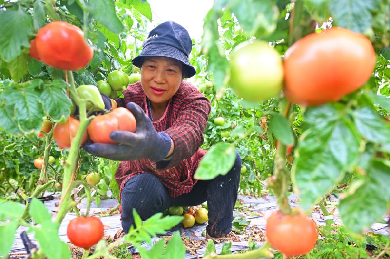 4月14日,在眉山市仁寿县谢安镇红英村源溪家庭农场,村民正在大棚采摘西红柿。 近年来,谢安镇采取“家庭农场+农户”的方式,规模化、标准化发展大棚西红柿产业,促进农业增效,带动农民增收。 特约通讯员 潘建勇 摄