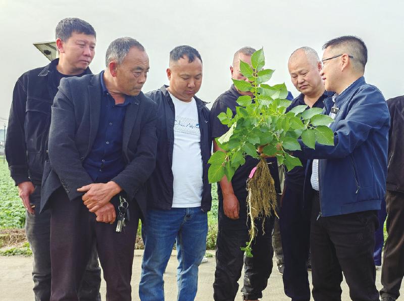 胡建军一边清除根部土壤,察看薯块发育情况,一边用通俗易懂的语言讲解:“块茎形成期最怕两件事,一是地上部分疯长抢养分,二是地下积水沤了根。当前管理重点就三个字——控、防、补。”他现场演示了如何根据叶色深浅、茎秆粗细判断植株营养生长与生殖生长的平衡度,并针对部分田块出现的封垄过早、通风透光差的问题,开出了化控加叶面补钾的“复方药剂”。