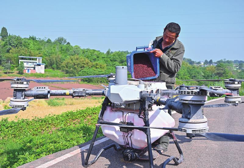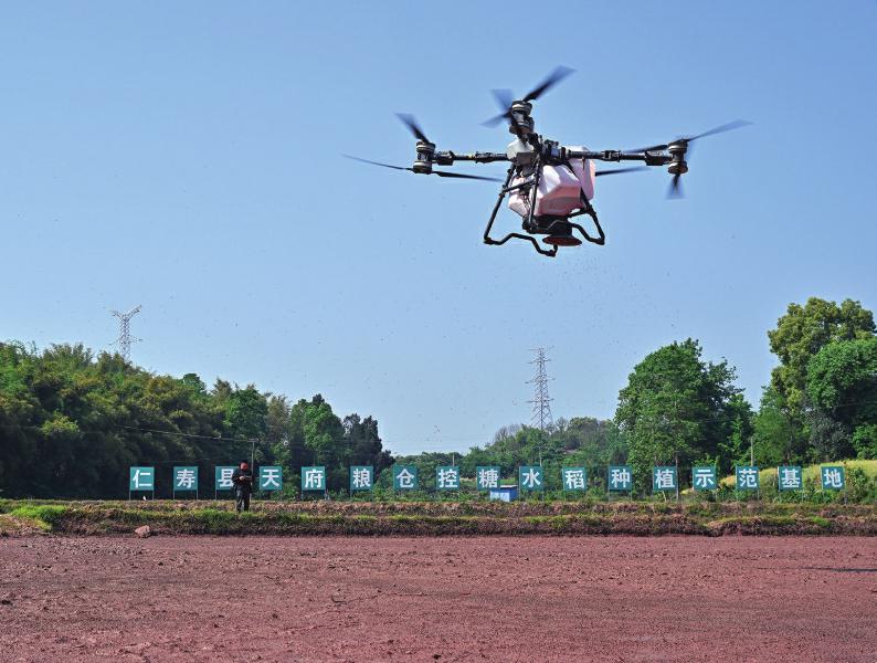 4月24日,在仁寿县慈航镇永勤村,一台植保无人机在进行水稻飞播作业。 当前正值春耕春播时期,地处丘陵的仁寿县积极推广无人机飞播作业。据了解,无人机飞播作业,具有省工、节本、效率高等优点。 特约通讯员 潘帅 摄