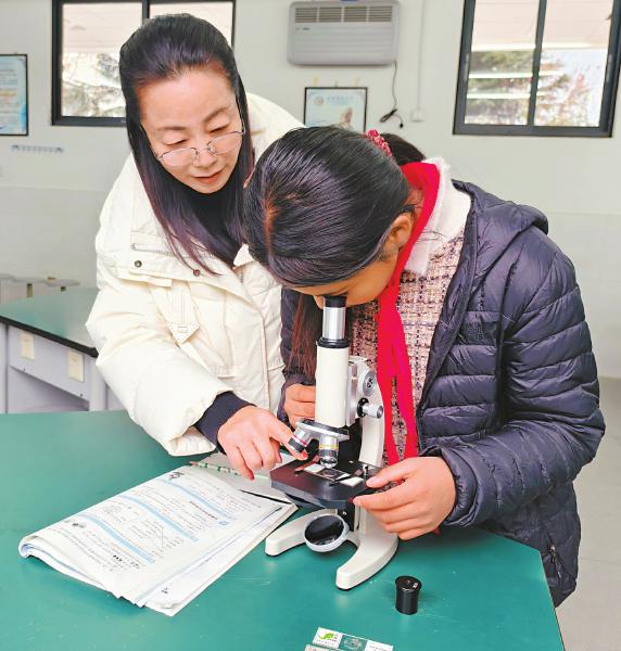 12月8日,阿坝藏族羌族自治州茂县凤仪小学校科学课堂上,孩子们用上了高倍显微镜。这批新教学设备,来自在这里支教的浙江省海宁市斜桥中学退休教师徐丹英发动的捐赠。